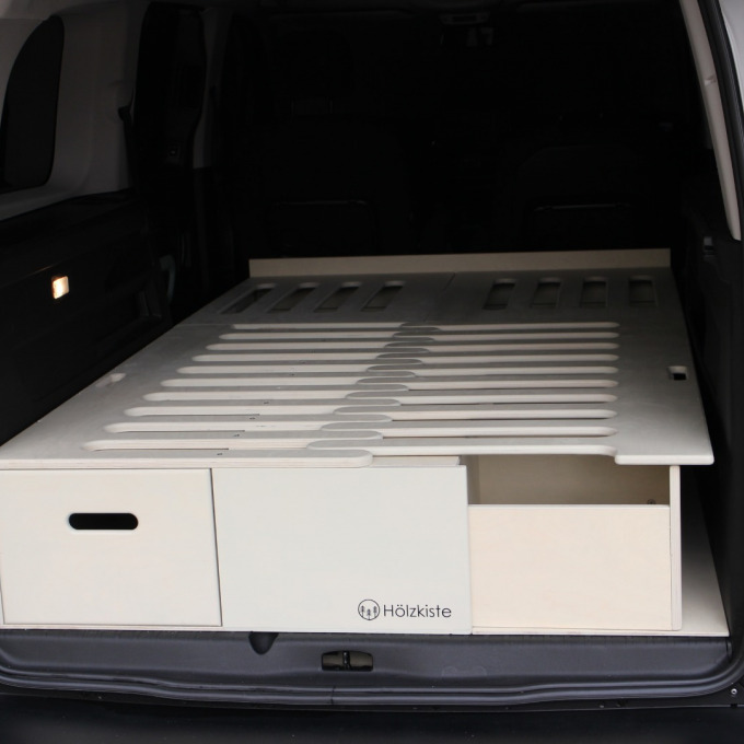 Die Hölzkiste besitzt einen Auszug nach hinten, der als Tisch genutzt werden kann und jede Menge individuellen Stauraum z.B. für Kocher und andere Campingutensilien beinhaltet.